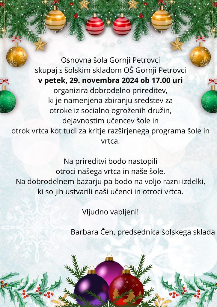 Osnovna šola Gornji Petrovci vas vabi na dobrodelno prireditev, ki bo v petek, 29. 11. 2024, ob 17. uri, v šolski telovadnici. Namen prireditve bo zbiranje dobrodelnih prispevkov za učence iz socialno šibkih družin, kot tudi za dejavnosti vseh učencev šole in otrok vrtca Jurček. Božično-novoletni bazar bo na podlagi sodelovanja v projektu Erasmus+ imel poudarek na trajnostnem razvoju. Na sami prireditvi bodo nastopali otroci vrtca Jurček ter učenci razredne in predmetne stopnje.
