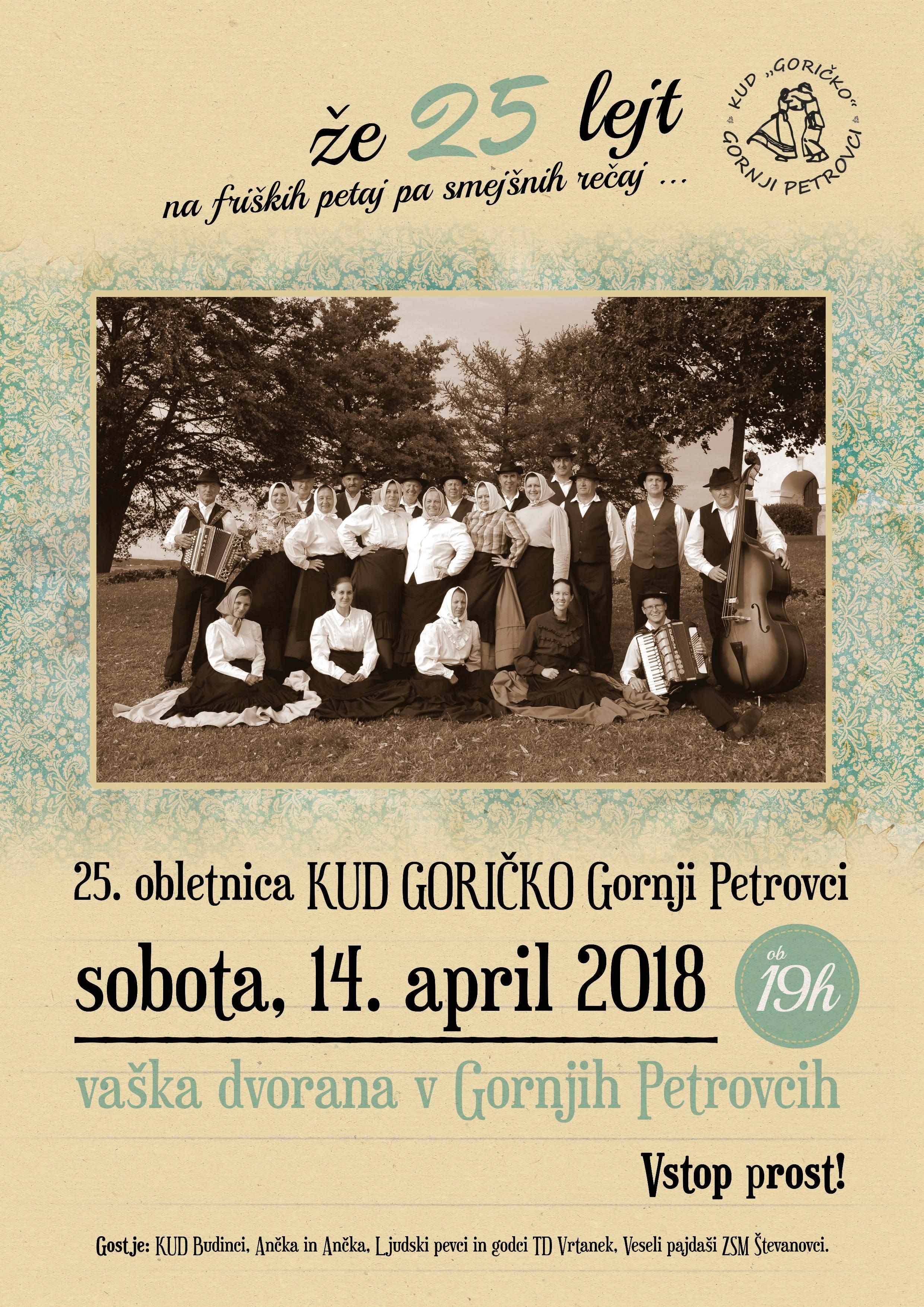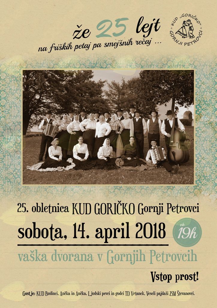 Kulturno umetniško društvo GORIČKO vas vabi na prireditev v počastitev 25. obletnice delovanja društva. Prireditev bo v soboto, 14.04.2018 v vaškem domu v Gornjih Petrovcih, ob 19.00 uri.