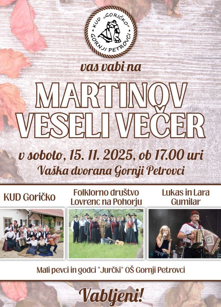 KUD Goričko Gornji Petrovci vas vabi na prireditev Martinov veseli večer, ki bo v soboto, 15. 11. 2025, s pričetkom ob 17. uri, v Vaški dvorani Gornji Petrovci. Na odru bodo poleg domače folklorne skupine nastopili: Folklorno društvo Lovrenc na Pohorju, Mali pevci in godci »Jurčki« iz Osnovne šole Gornji Petrovci ter Lukas in Lara Gumilar.Lepo vabljeni, da skupaj počastimo dan, ko se mošt spremeni v vino.