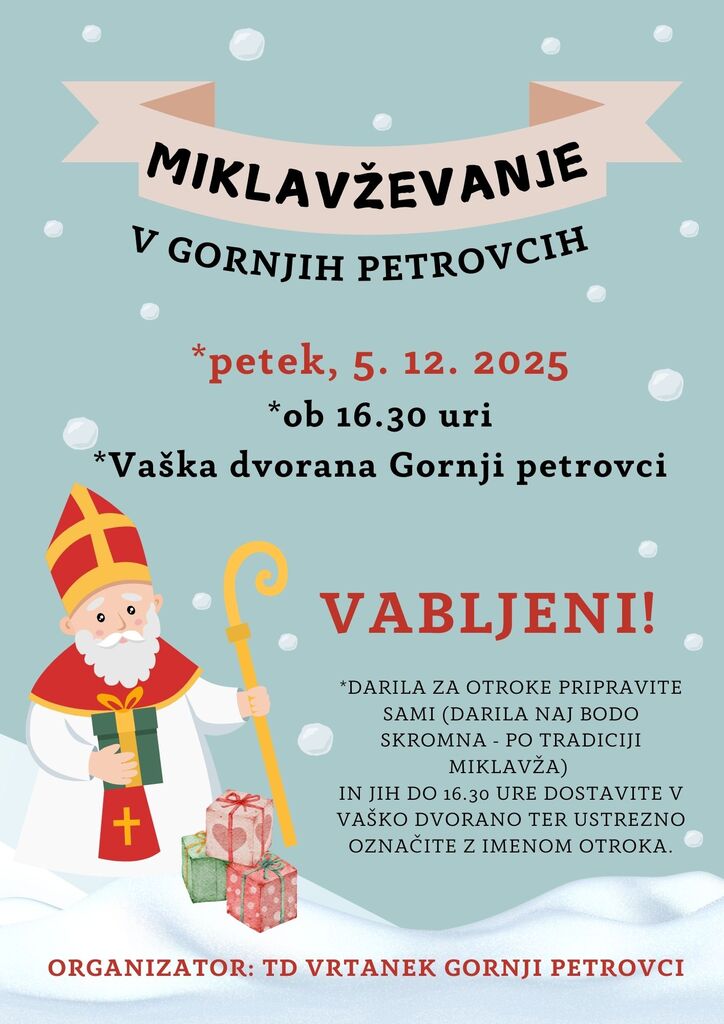 TD Vrtanek Gornji Petrovci bo letos ponovno organiziralo Miklavževanje za otroke iz cele občine, ki bo v petek, 5. 12. 2025, ob 16.30 uri, v Vaški dvorani Gornji Petrovci.