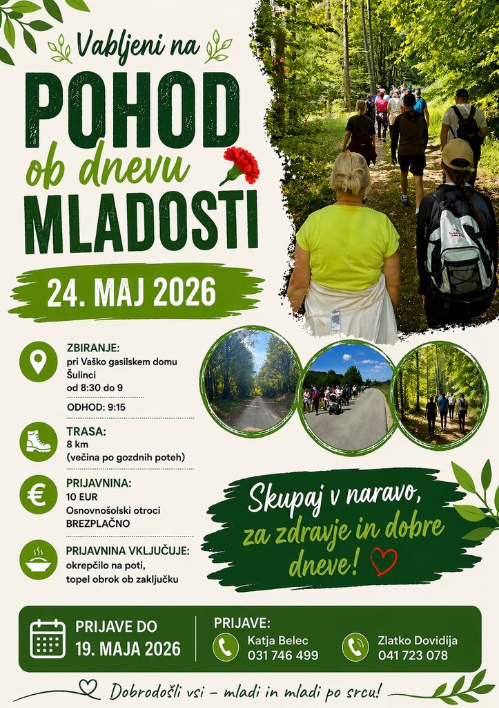 ŠKTD Šulinci vas vabi na Pohod ob dnevu mladosti, ki bo v nedeljo, 24. maja 2026. Zbiranje pohodnikov od 8.30 dalje pri Vaško – gasilskem domu Šulinci, start ob 9.15. Prijeten, 8 km dolg pohod v naravi bo potekal večinoma po gozdnih poteh. Prijavnina znaša 10 € in vključuje okrepčilo na poti in toplo malico ob koncu. Za osnovnošolce prijavnine ni.