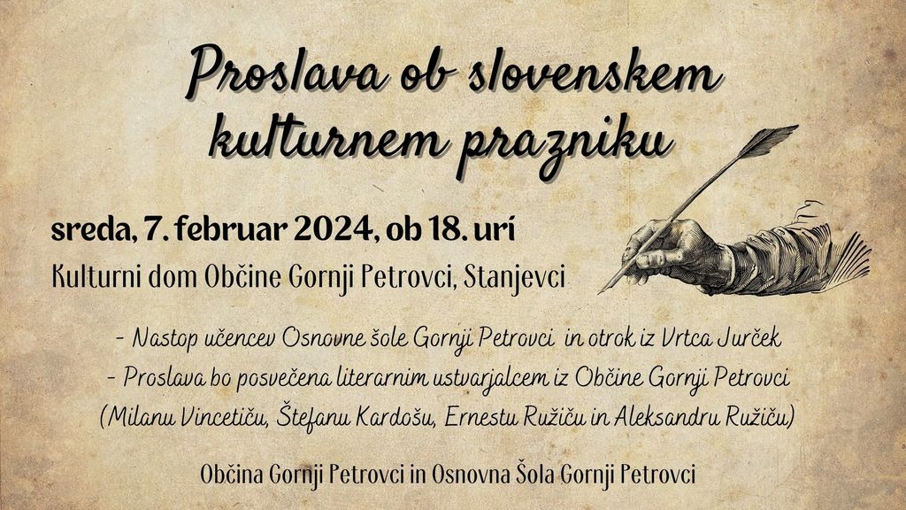 Občina Gornji Petrovci vas v sodelovanju z Osnovno šolo Gornji Petrovci vljudno vabi na proslavo ob slovenskem kulturnem prazniku, ki bo v sredo, 7. 2. 2024, ob 18. uri,