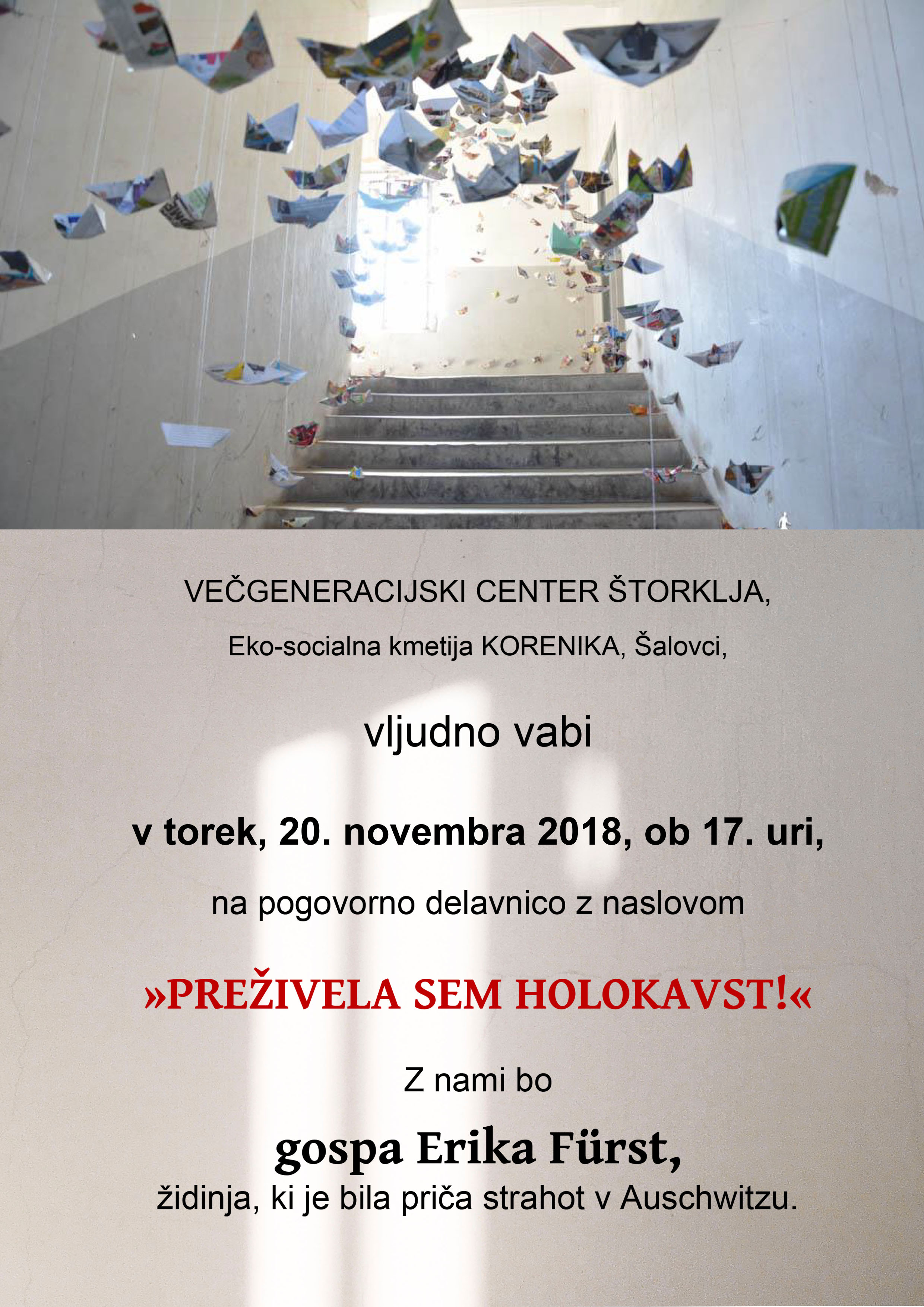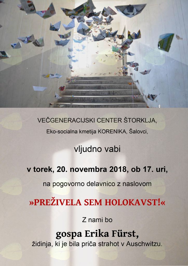 Pred 2. svetovno vojno je pri nas največ Judov živelo prav v Prekmurju in le redki med njimi so preživeli holokavst. Gospa Erika Fürst je ena izmed treh še živečih Židinj na območju Pomurja, ki so bile priče strahot v Auschwitzu. Svojo izjemno ganljivo zgodbo bo z nami delila v spomin, predvsem pa v opomin, da bomo v današnjem času znali razumno premagovati vse oblike nestrpnosti in predsodkov.