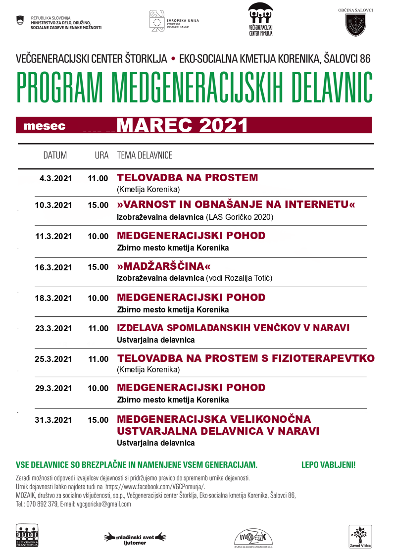 VEČGENERACIJSKI CENTER ŠTORKLJA, kmetija KORENIKA v Šalovcih, vas v mesecu MARCU vabi na brezplačne medgeneracijske aktivnosti in delavnice.