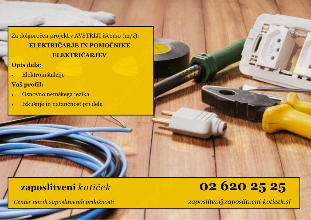 Priložnost za zaposlitev z direktno AVSTRIJSKO POGODBO se ponuja 30 ELEKTRIČARJEM in POMOČNIKOM ELEKTRIČARJEV za zaključek projekta v Innsbrucku v Avstriji. Delo je plačano po avstrijski kolektivni pogodbi, za nastanitev sodelavcev je poskrbljeno. Zahtevane so izkušnje in natančnost pri delu, ter osnovno znanje nemškega jezika. Pričetek dela je možen takoj.
