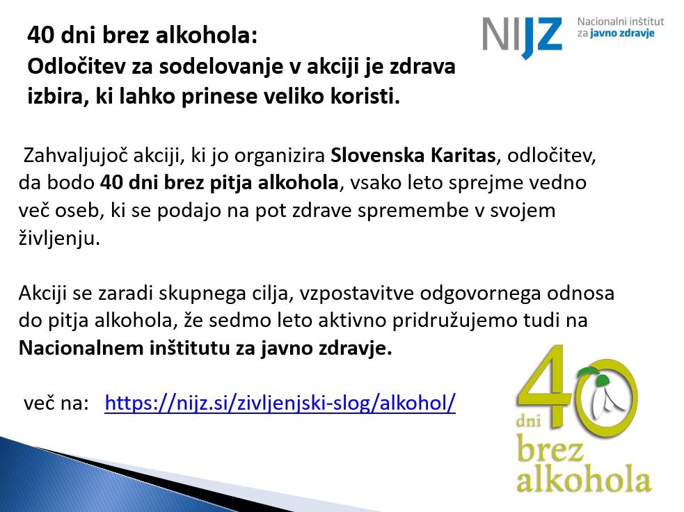 Z Nacionalnim inštitutom za javno zdravje se priključujemo akciji 40 dni brez alkohola, s katero želimo soustvarjati prostor v Sloveniji, ki bi z zmanjšanjem pitja alkohola, preprečil negativne posledice, ki jih pitje predstavlja za slovensko prebivalstvo.