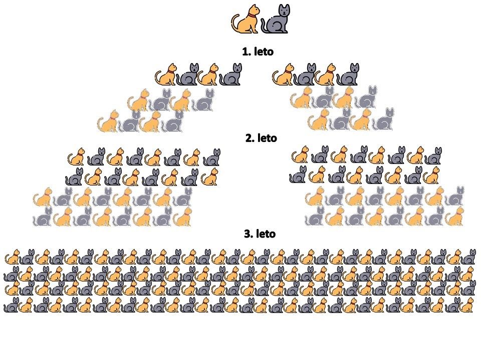 Če mačka koti 2x na leto po 4 mladiče. Pri enem letu imajo že muce svoje mladiče in tako naprej. Istočasno se več let razmnožuje več generacij.