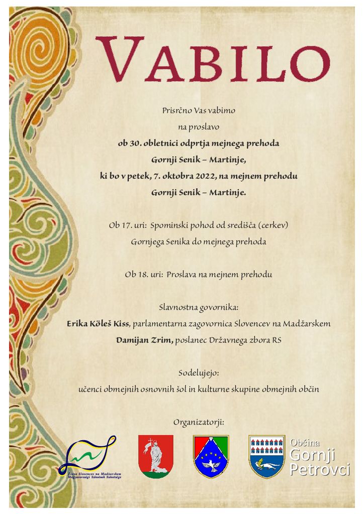Vabimo vas na proslavo ob 30. obletnici odprtja mejnega prehoda Gornji Senik – Martinje, ki bo v petek, 07.10.2022, na mejnem prehodu Gornji Senik – Martinje, ob 18.00 uri. Slavnostni govorniki bodo: Erika Köleš Kiss, parlamentarna zagovornica Slovencev na Madžarskem, Damijan Zrim, poslanec Državnega zbora RS, Srečko Kalamar in Andrej Gerenčer. V kulturnem programu sodelujejo učenci obmejnih osnovnih šol in kulturne skupine obmejnih občin.