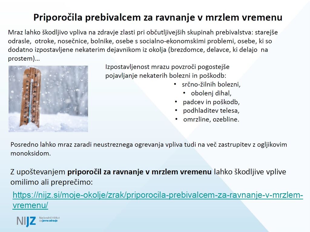 Mraz lahko škodljivo vpliva na zdravje zlasti pri občutljivejših skupinah prebivalstva. Z upoštevanjem priporočil za ravnanje v mrzlem vremenu lahko škodljive vplive omilimo ali preprečimo.