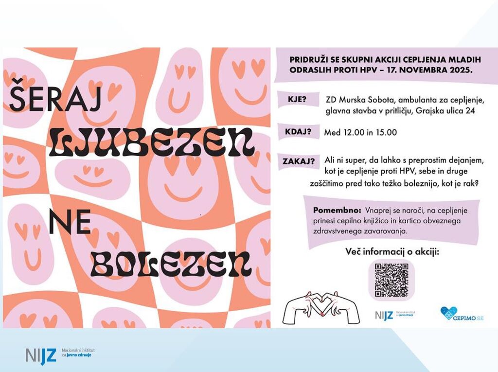 Več o akciji cepljenja lahko preberete na https://nijz.si/nalezljive-bolezni/cepljenje/proti-hpv-skupaj-v-akciji-seraj-ljubezen-ne-bolezen-2/, več o HPV in posledicah okužb med mladimi in mladimi odraslimi pa https://nijz.si/nalezljive-bolezni/hpv-mali-virus-velike-posledice-kako-se-zasciti-pred-okuzbo/.