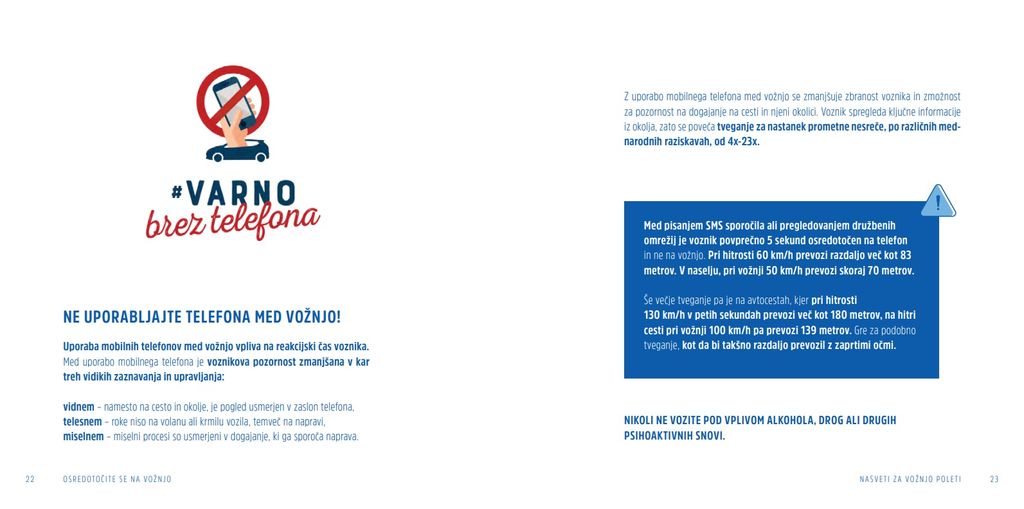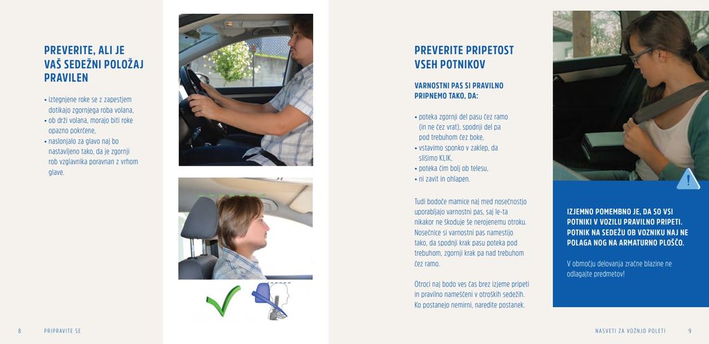 Med vožnjo bodite strpni, prilagodite hitrost vožnje razmeram na cesti in ravnajte defenzivno, vzdržujte ustrezno varnostno razdaljo. Ne uporabljate mobilnega telefona in vozite trezni! Med daljšo vožnjo naj vozniki poskrbijo za redne postanke, približno na vsaki dve uri. V primeru, da je na potovanju več oseb z veljavnim vozniškim dovoljenjem, naj si ti vožnjo »razdelijo«, s tem tudi zmanjšajo tveganje za vožnjo pod vplivom utrujenosti ali zaspanosti.