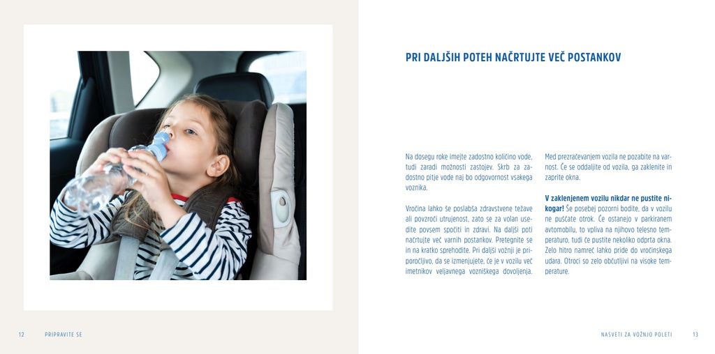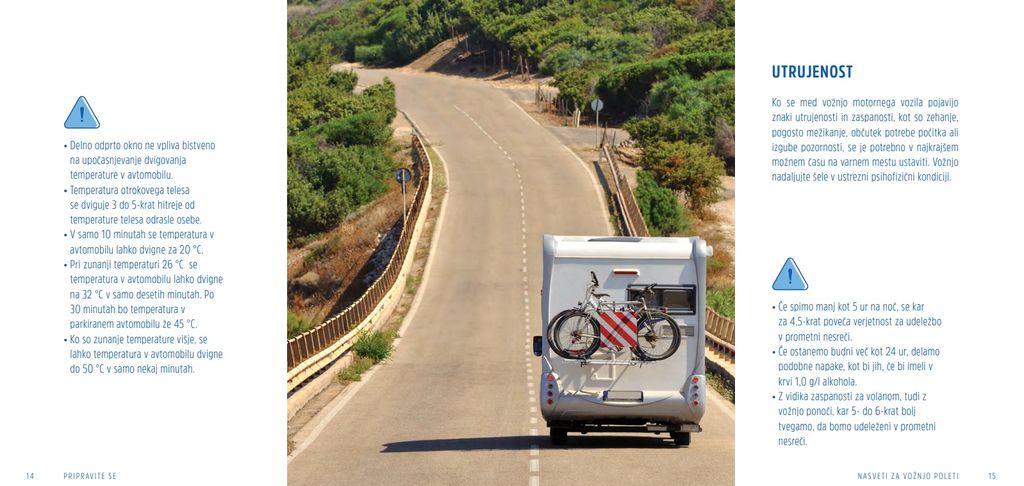 Če se med vožnjo pojavijo znaki utrujenosti in zaspanosti, kot so zehanje, pogosto mežikanje, občutek potrebe počitka ali izgube pozornosti, se je potrebno v najkrajšem možnem času na varnem mestu ustaviti ter poskrbeti za ustrezno psihofizično stanje. V parkiranem in zaprtem vozilu nikdar ne puščajte nikogar, saj lahko hitro pride do toplotnega udara! Temperature v avtomobilu, ki stoji, izjemno hitro naraščajo. Že pri zunanji temperaturi 22 stopinj C temperatura v vozilu naraste na 47 stopinj C v le eni uri. Če je zunaj 32 stopinj C, je v vozilu po 20 minutah že 49 stopinj C. Višje zunanje temperature in daljši čas stanja na soncu seveda pomenijo še višje temperature v zaprtem vozilu. Zato vselej, preden odidete na pot, četudi je kratka, vozilo dobro prezračite in ohladite.