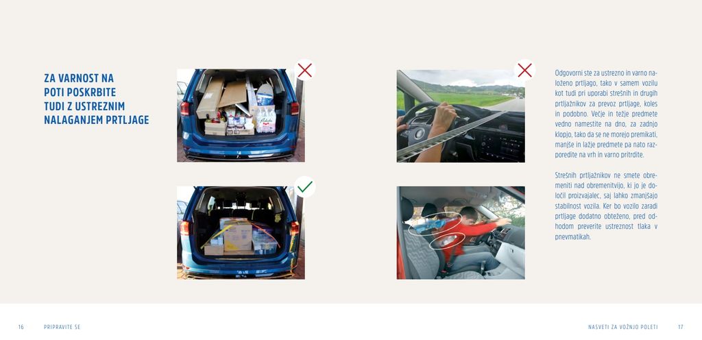 Prtljaga naj bo v vozilo zložena pravilno in varno pritrjena, težjo kosi naj bodo na dnu, za zadnjo klopjo. Prtljago ustrezno pritrdimo oziroma zavarujemo, da ob morebitnem trku ne poleti z mesta. Naletna teža mobilnega telefona, ki tehta 200 gramov, je pri trku vozila s hitrostjo 50 km/h, kar 5-6 kilogramov. Če nas med trkom zadane, lahko utrpimo resne poškodbe. Ustrezno pospravljeni predmeti med vožnjo so tako za varnost voznika in potnikov nujni. Zagotovite dobro preglednost skozi vsa okna in ogledala. Ker bo vozilo zaradi prtljage dodatno obteženo, pred odhodom preverite ustreznost tlaka v pnevmatikah. Poskrbite za zadostne količine vode za vse potnike v vozilu. Preverite pravilno in dosledno pripetost vseh potnikov in uporabo otroških zadrževalnih sistemov.