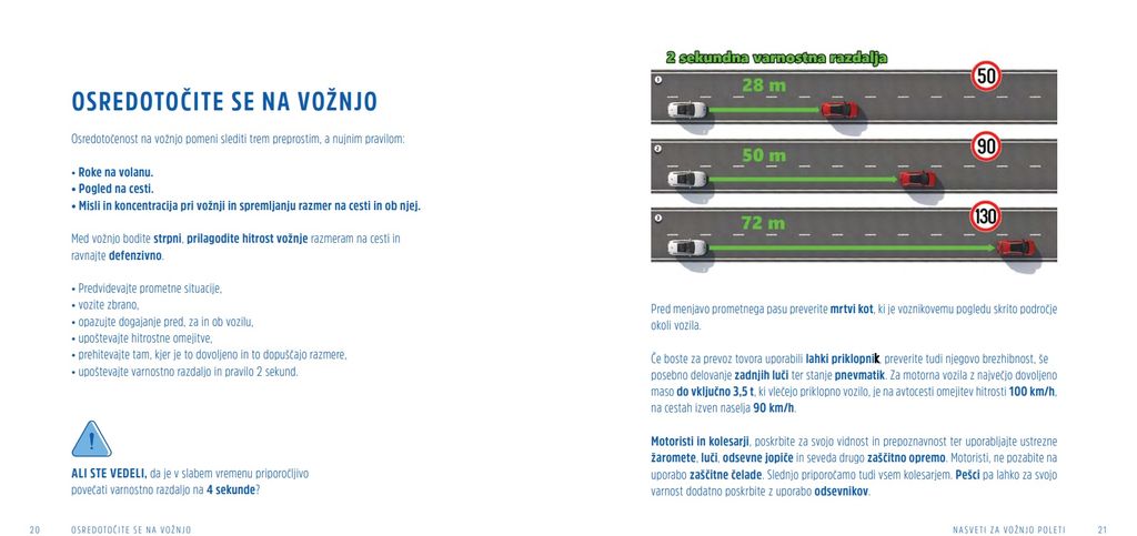 Vožnja je zahtevno opravilo, zato se povsem osredotočite nanjo. Osredotočenost na vožnjo pomeni slediti trem preprostim, a nujnim pravilom: