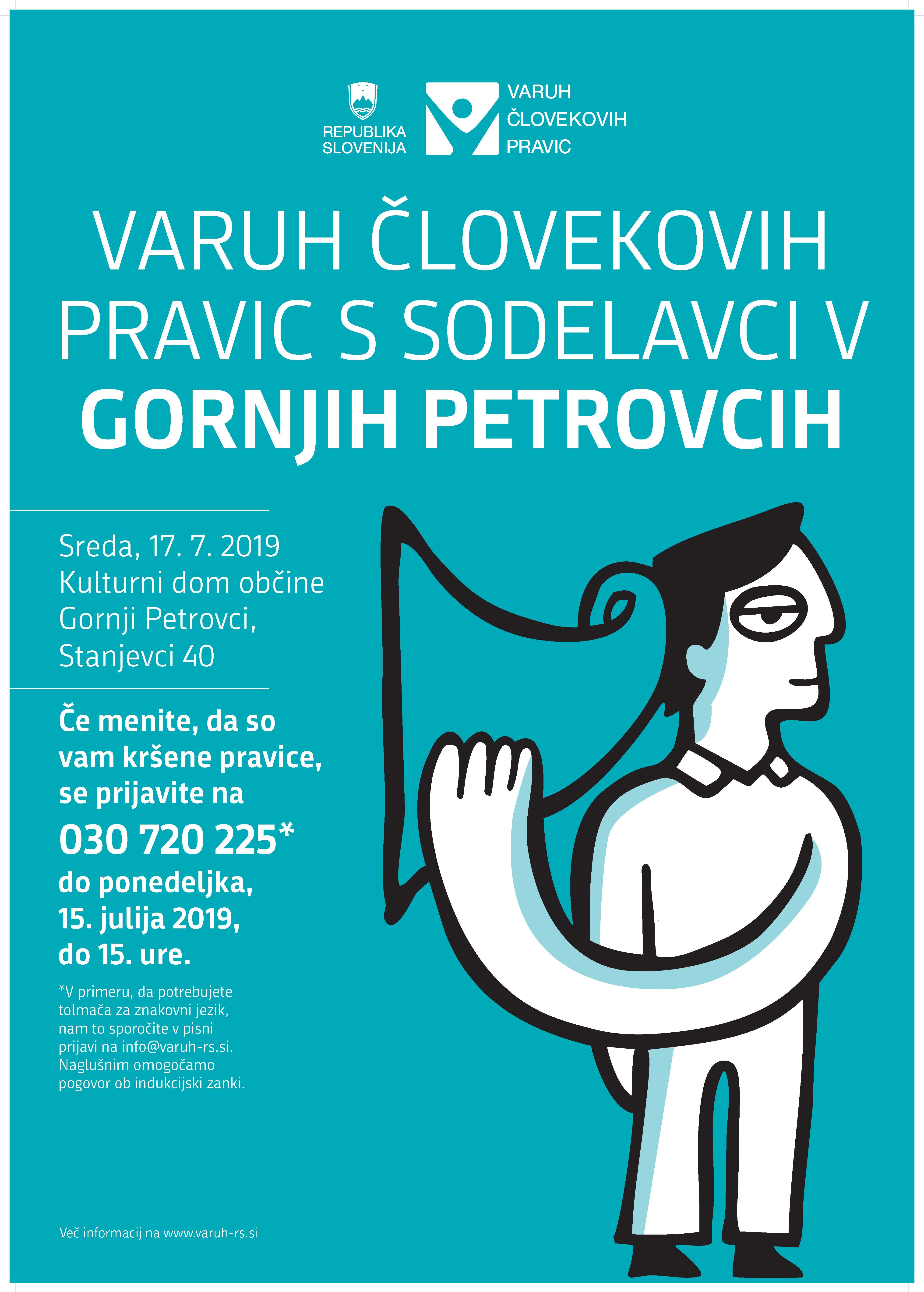 Vsi, ki menijo, da so jim kršene pravice in bi jim lahko varuh s sodelavci pomagal, lahko pokličejo na telefonsko številko 030 720 225. To lahko storijo najkasneje do ponedeljka, 15. 7. 2019, do 15. ure in se naročijo na polurni pogovor. Pogovori bodo potekali v prostorih kulturnega doma občine Gornji Petrovci v Stanjevcih na naslovu Stanjevci 40.
