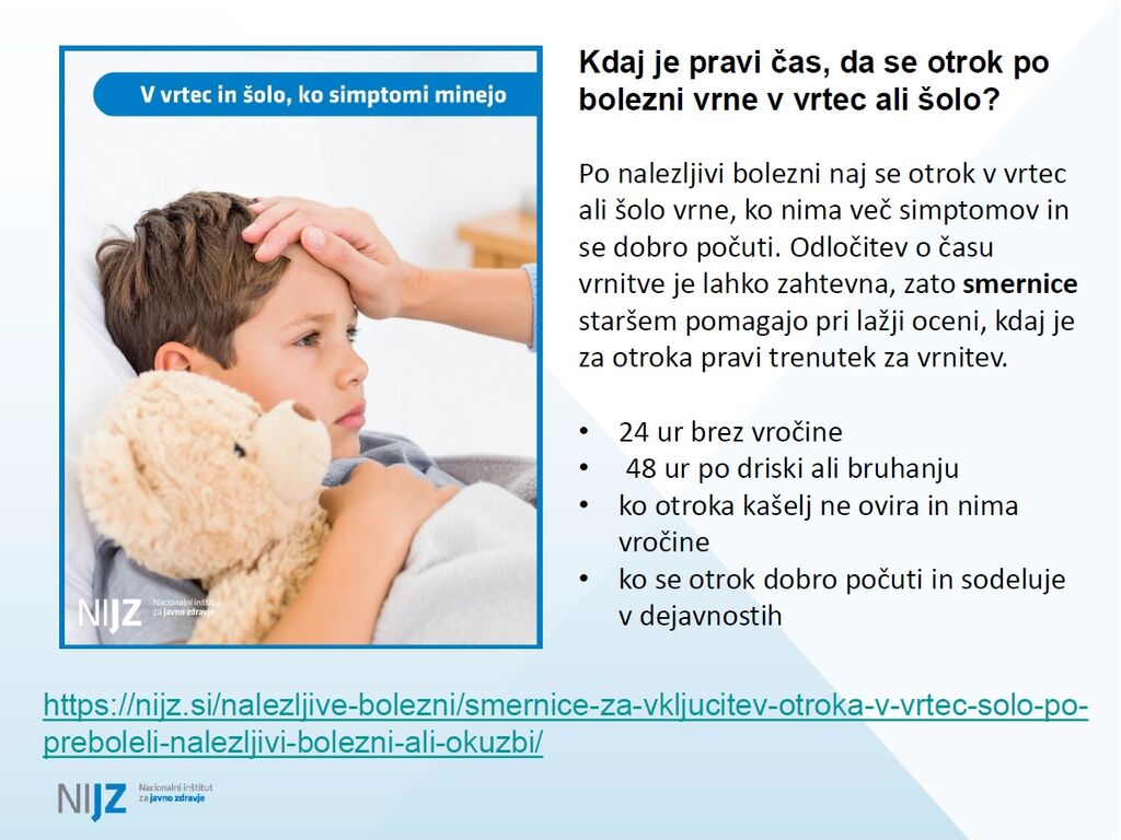 Po nalezljivi bolezni naj se otrok v vrtec ali šolo vrne, ko nima več simptomov in se dobro počuti. Odločitev o času vrnitve je lahko zahtevna, zato smernice staršem pomagajo pri lažji oceni, kdaj je za otroka pravi trenutek za vrnitev.