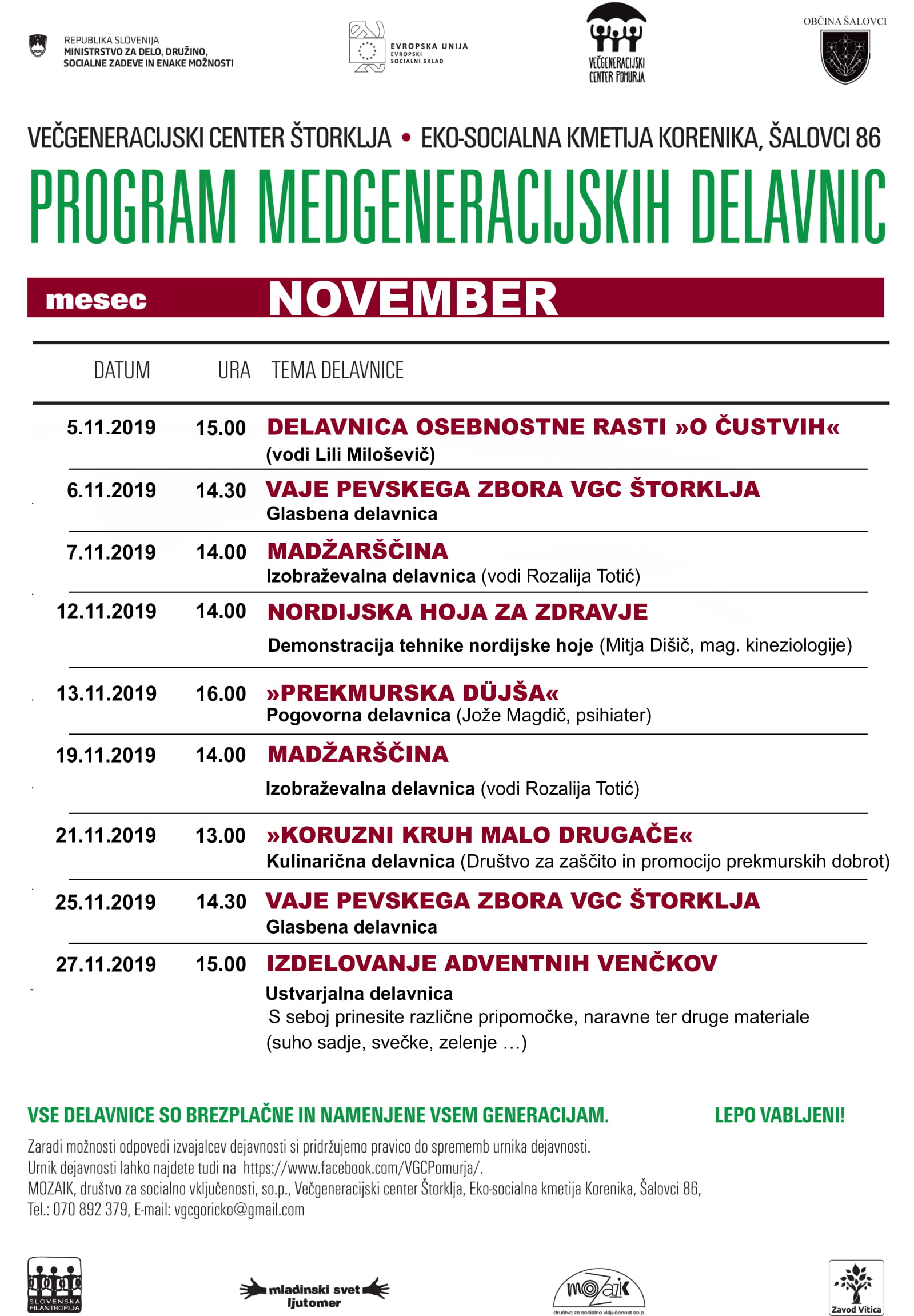 Program delavnic v Večgeneracijskem centru štorklja na eko-socialni kmetiji Korenika v Šalovcih, v mesecu novembru.