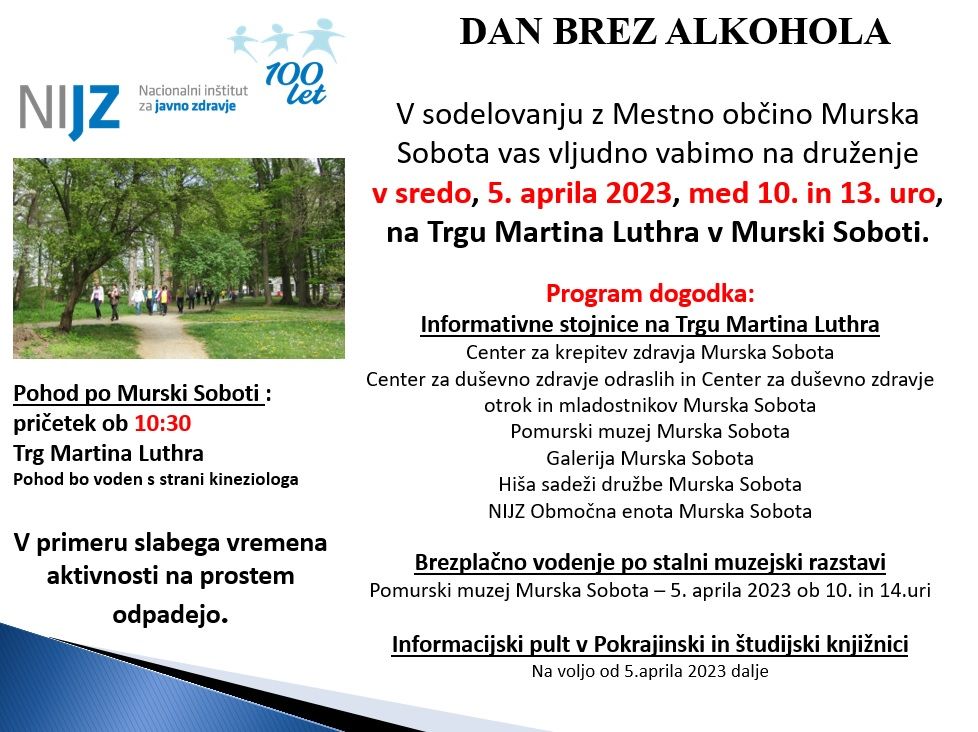 Več vsebine in program dogodka na povezavi: https://nijz.si/dogodki/dan-brez-alkohola-v-murski-soboti/
