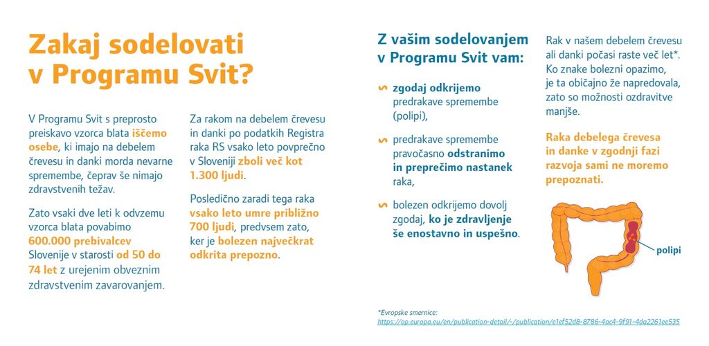 Rak debelega črevesa in danke spada med pogostejše rake pri nas. S pravočasnim zgodnjim odkrivanjem in odstranjevanjem predrakavih sprememb (adenomatoznih polipov), iz katerih se v veliki večini primerov razvije ta oblika raka, bolezen lahko celo popolnoma preprečimo. Za odkrivanje bolezni v zgodnjih fazah se v programu Svit uporablja laboratorijska (imunokemična) metoda pregleda blata na neopazno in prikrito krvavitev. Kri lahko izvira iz polipa, tumorja ali druge bolezni prebavil. Za dokončno potrditev je zato potrebno opraviti nadaljnje preiskave, kar v Programu Svit pomeni kolonoskopijo. Če se potrdi prisotnost bolezni ali sprememb z večjim tveganjem, se zdravljenje lahko začne prej, je manj zapleteno in praviloma uspešnejše. Zahvaljujoč delovanju Programa Svit je število obolelih za rakom debelega črevesa in danke v Sloveniji pričelo opazno upadati.