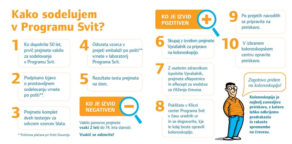 Zdravje lahko pomembno okrepimo in ohranjamo s primerno skrbjo zanj. Nepogrešljiv del zdravega življenjskega sloga je tudi odzivanje na vabila v presejalne preventivne programe. V mesecu marcu obeležujemo mednarodni mesec boja proti raku debelega črevesa in danke, z namenom osveščanja o bolezni, o tem, kako preprečevati nastanek bolezni in tudi o možnostih, ki nam jih daje presejalni program. Skupaj z mrežo podpornikov, ambasadorjev, sodelavcev ter samih udeležencev v programu smo prehodili pomembno pot in skupaj ustvarili enega najuspešnejših programov ne le v Sloveniji, ampak tudi v svetu. Z namenom doseganja čim višje odzivnosti v Programu Svit se bomo še naprej skušali približati prav vsakemu. Vse, ki prejmejo vabilo, vabimo, da se na vabilo tudi odzovejo. Hkrati pa vabimo tudi vse s pozitivno izkušnjo udeležbe v programu k motivaciji svojih bližnjih, da se tudi sami odzovejo vabilu.