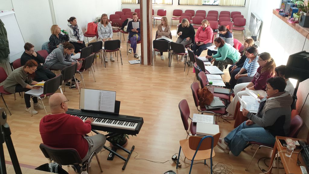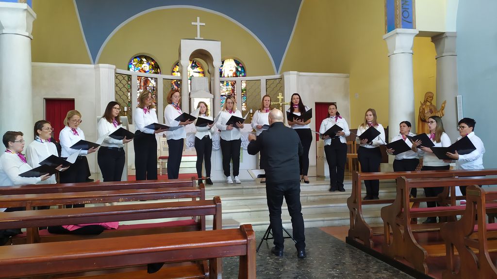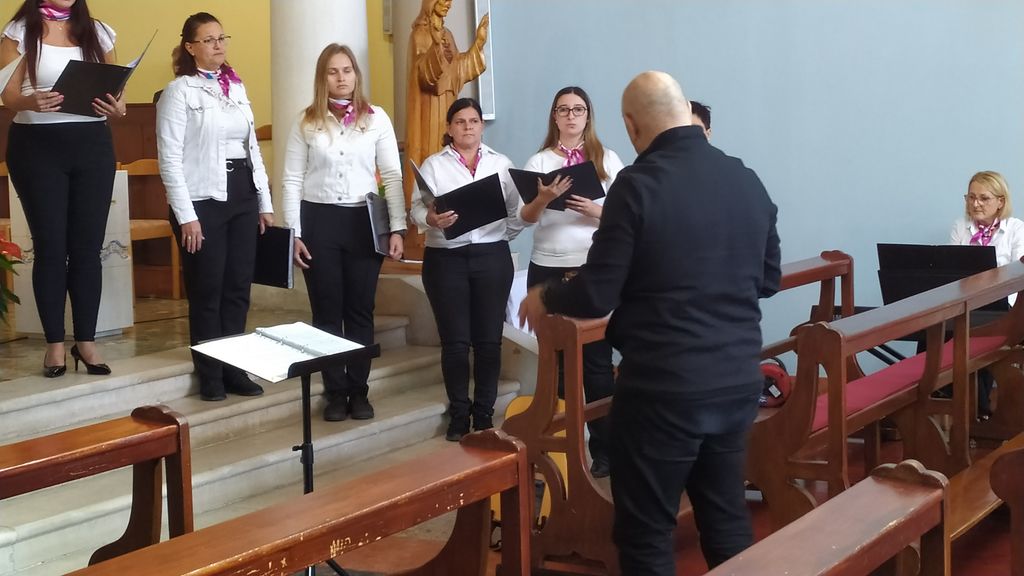 Nedeljsko jutro je po dobrem zajtrku zaznamovalo upevanje in priprava naših glasilk za nastop po nedeljski sveti maši. Zelo rade gostujemo v tujini, saj s tem pridobivamo nova poznanstva in izkušnje, ter sklepamo nova sodelovanja, kar poleg naše lastne prepoznavnosti zbora Biser, doprinese tudi dobro noto in besedo o slovenskih zborih. Za uspešno izveden nastop je poskrbel naš zborovodja Fernando, ki nas je poleg vodenja spremljal še na različnih inštrumentih, in tako s pesmimi, kot so Besede ljubezni in pa Le v Bogu umiri se srce, navdušil naše poslušalce, ki so nas sprejeli nasmejanih in odprtih rok. Po nastopu smo strnile naše občutke ob koncu intenzivnega pevskega vikenda in se ob prijazni pogostitvi našega gostitelja fra Anteja poslovile, v veselem pričakovanju naslednjih sredinih pevskih vaj.