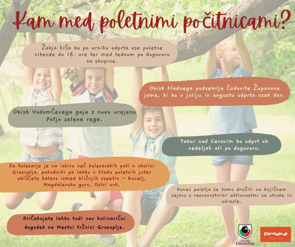 - kolesarji se lahko zapeljejo po več kolesarskih poteh v okolici Grosuplja, pohodniki pa v hladu poletnih juter obiščejo katero izmed bližnjih vzpetin – Kucelj, Magdalensko goro, Ostri vrh. Karte z vrisanimi potmi lahko prejmete v Tic-u v Koščakovi hiši na Adamičevi cesti ali na spletni strani Turizma Grosuplje.