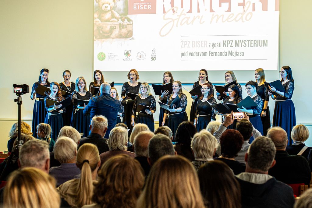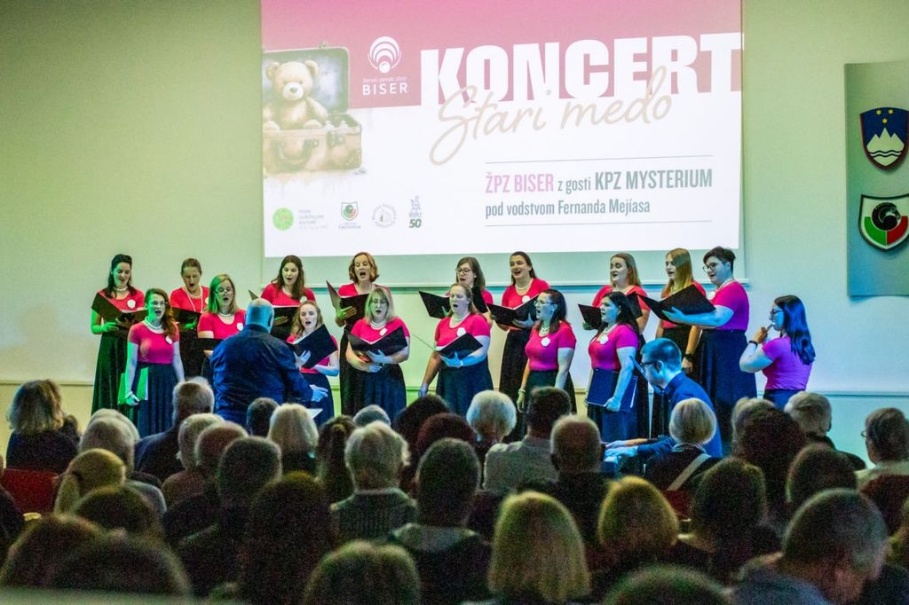 Zakaj stari medo, se sprašujete? Vsako dodatno leto, ki ga človek dopolni, za seboj pusti še eno poglavje spominov, ki se v nas kopičijo kot tiha zakladnica, ki jo odpremo v trenutkih tišine, topline in hrepenenja. To so spomini na stare čase in lepe trenutke življenja, ki jih nežno objame ena sama beseda – nostalgija. Nostalgija na čase, ko smo bili brez skrbi in smo uteho iskali v plišastih podobah varnosti in v njihovem mehkem objemu. In prav ta je bila izhodišče, srce in navdih letošnjega koncerta, ki smo ga skupaj z gosti Komornega pevskega zbora Mysterium iz Kranja pričarale Biserke. Z gosti nas ne povezuje le ljubezen do glasbe, temveč tudi skupni zborovodja Fernando Pablo Mejías, ki s svojo predanostjo vedno znova pusti srčni pečat na koncertih. Pevci obeh zborov smo mu iskreno hvaležni, da nas vodi z dušo, potrpežljivostjo in izjemnim občutkom za glasbo in ljudi.