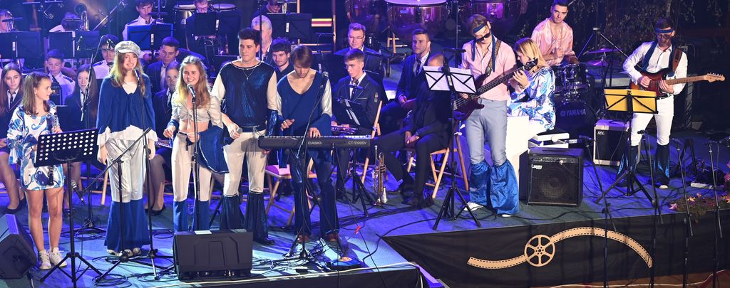 Po rdeči preprogi v filmski svet – nekateri s kokicami, drugi s fotografijo s svojim najljubšim filmskim junakom, tretji z vrčkom točenega, vsi skupaj pa z velikim zanimanjem, kako nas bodo godbeniki presenetili tokrat. Sledilo je dobri dve uri najraznovrstnejše filmske dovršeno izvedene glasbe ob posnetkih popularnih in zimzelenih uspešnic na velikem platnu. Vmes pa za vsakogar nekaj; izpod odra so se pri Piratih s Karibov priplazili šentjoški pirati, zapela je prava Elza, v dežju se je plesalo step, oder so obiskali člani skupine Abba, svoj del je odigral znani Rowan Atkinson ali bolj poznani Mr. Bean, zapel je Frank Sinatra, Urška Kastelic je sanjala o boljših časih, nune so prišle kar iz Polhovega Gradca, pri Očenašu v swahiliju so se jim pridružili še moški z vseh vetrov, pa zatem polno otrok z Glasbene šole Emil Adamič.