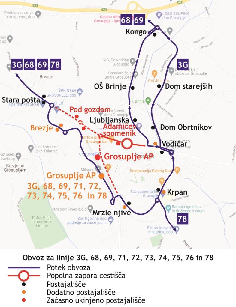 Liniji 68 in 69: bosta obratovali po Industrijski cesti, mimo začasnega postajališča pri podhodu z železniško progo, nato po Taborski – Župančičevi – Cesti na Krko - na Adamičevo cesto in redno traso ter enako v obratni smeri. Začasno postajališče bo pri Brezju pred krožiščem.