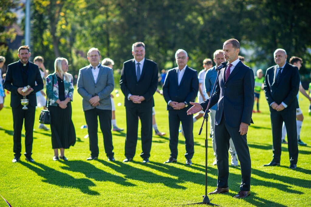 »V veliko čast in veselje mi je, da lahko odprem ta prečudovit park skupaj z vsemi vami,« je zbrane na slovesnem dogodku nagovoril predsednik Evropske nogometne zveze Aleksander Čeferin. »V časih, ko so naši otroci preveč za računalniki, preveč zaprti v sobah, je športna infrastruktura še kako pomembna,« je dejal. Vedeti pa moramo tudi, da ni naključje, da je takšen nogometni park zrasel ravno v Grosupljem. »Zato, ker Občina Grosuplje na čelu z županom dr. Petrom Verličem ogromno vlaga v infrastrukturo in zato vsa čast in globok poklon.« Dejal je, da je tudi minister Matjaž Han dosegel, da se v Sloveniji sedaj mnogo več investira v šport, kot se je investiralo prej. »Šport pomeni mnogo več, kot samo šport. Šport pomeni, da so mladi bolj zdravi, da jih je manj v kriminalu in več na igrišču,« je poudaril. Dejal pa je tudi, da pa je davčna politika, ki pa je na področju finančnega ministrstva, ena najbolj neugodnih v Evropi ravno v Sloveniji. »In na tem področju bi morala Slovenija narediti več.«