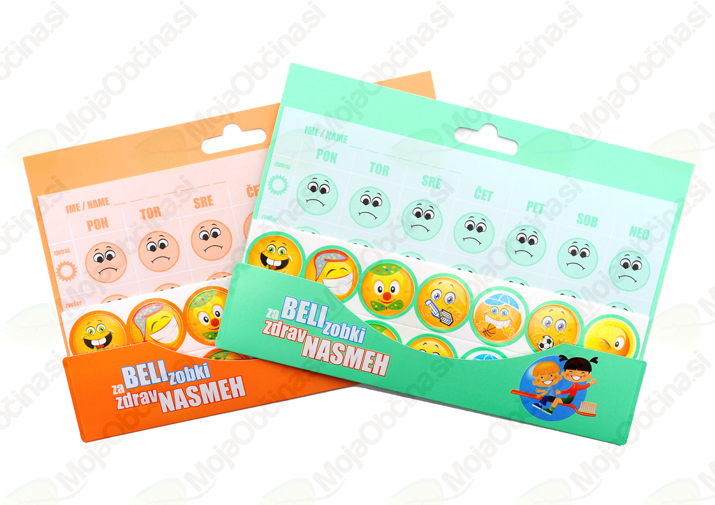 Vsakič, ko si otrok umije zobe, lahko čež žalostnega smeška nalepi nalepko veseli smeško . Na ta način otroka spodbudimo k redemu umivanju zob, straši pa imate boljši vpogled kako pogosto si vaš otrok umije zobe.