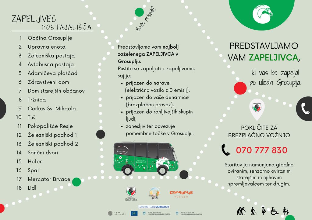 V Grosupljem smo tako dobili Zapeljivca, vozilo za javni prevoz potnikov. Prijazen do narave (električno vozilo z nič emisij), prijazen do naše denarnice (brezplačen prevoz), prijazen do ranljivejših skupin ljudi. Zapeljal nas bo do mestne tržnice, zdravstvenega doma, doma starejših občanov, mestne knjižnice, lekarne, cerkve sv. Mihaela ali pa po nakupih do naše najljubše trgovine.