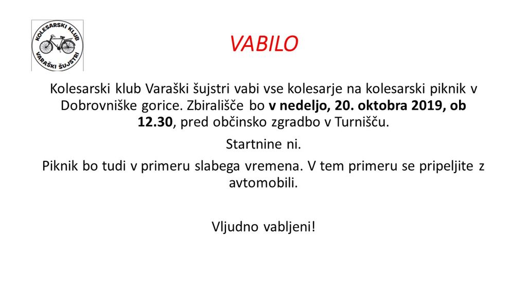 Vabljeni na kolesarski piknik v Dobrovške gorice, ki bo to nedeljo, 20. oktobra 2019, ob 12.30. Več informacij je na fotografiji.
