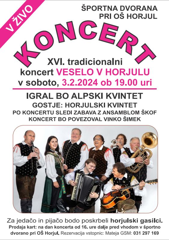 Gasilci PGD Horjul vas vabimo na že 16. tradicionalni koncert Veselo v Horjulu. Skozi koncert vas bodo popeljali legendarni ALPSKI KVINTET gostje na koncertu bodo: Horjulski kvintet Program bo povezoval VINKO ŠIMEK Po koncertu sledi VESELICA Z ANSAMBLOM ŠKOF PRODAJA VSTOPNIC (miza ali tribuna): na dan koncerta od 16.00 ure dalje, pred vhodom v Športno dvorano pri OŠ Horjul. Cena vstopnice je 15€. Rezervacija vstopnic: Mateja 031/297-169 Otroci do vključno 6. leta starosti imajo prost vstop, če sedijo v naročju staršev ali skrbnikov.
