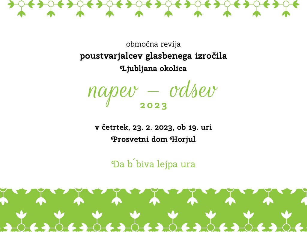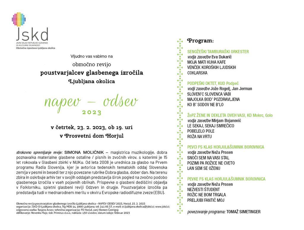 Vabljeni na območno revijo poustvarjalcev glasbenega izročila Napev - odsev 2023, ki ga organizira JSKD - OI Ljubljana okolica.