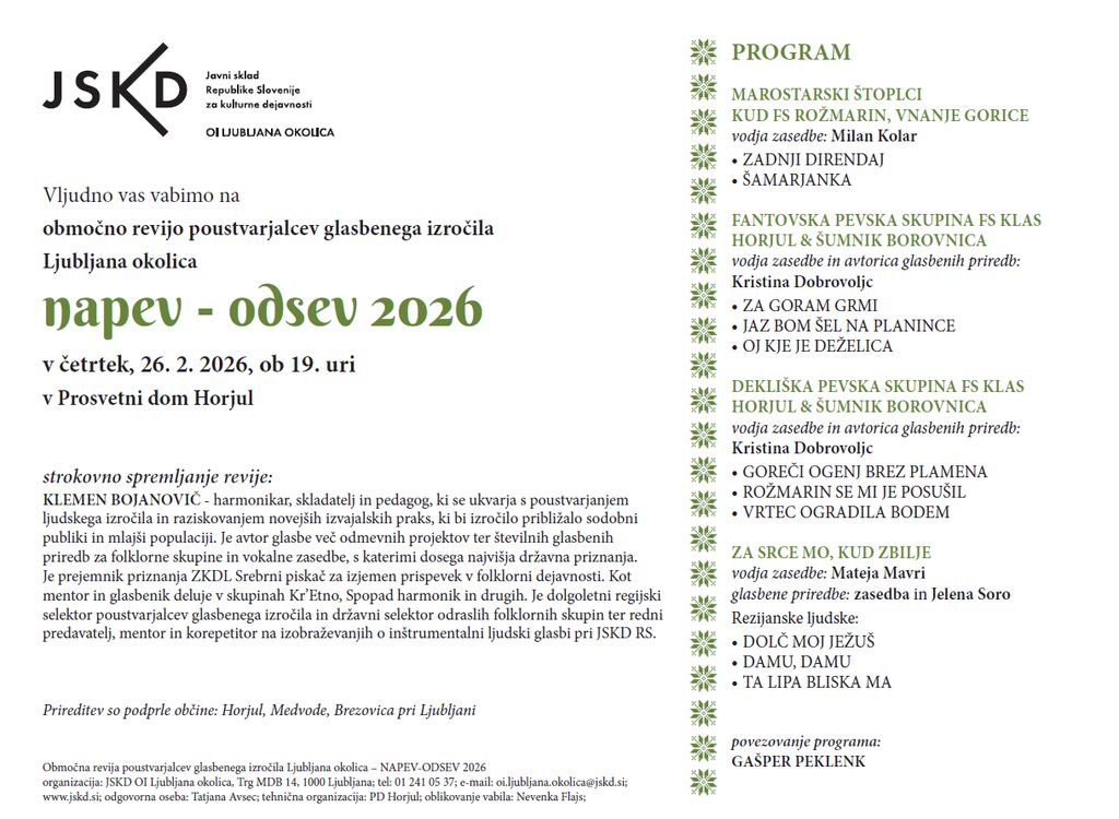 Organizator: PROSVETNO DRUŠTVO HORJUL in JSKD, OI Ljubljana okolica