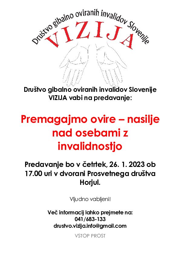 Vabljeni na predavanje Društva gibalno oviranih invalidov Slovenije Vizija Premagajmo ovire - nasilje nad osebami z invalidnostjo.