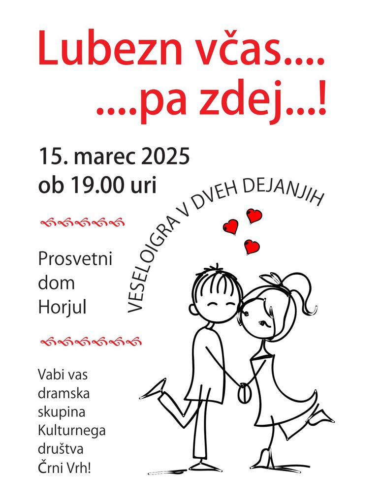 Vabljeni na veseloigro v dveh dejanjih Lubezn včas... pa zdej... ! v izvedbi dramske skupine Kulturnega društva Črni Vrh.