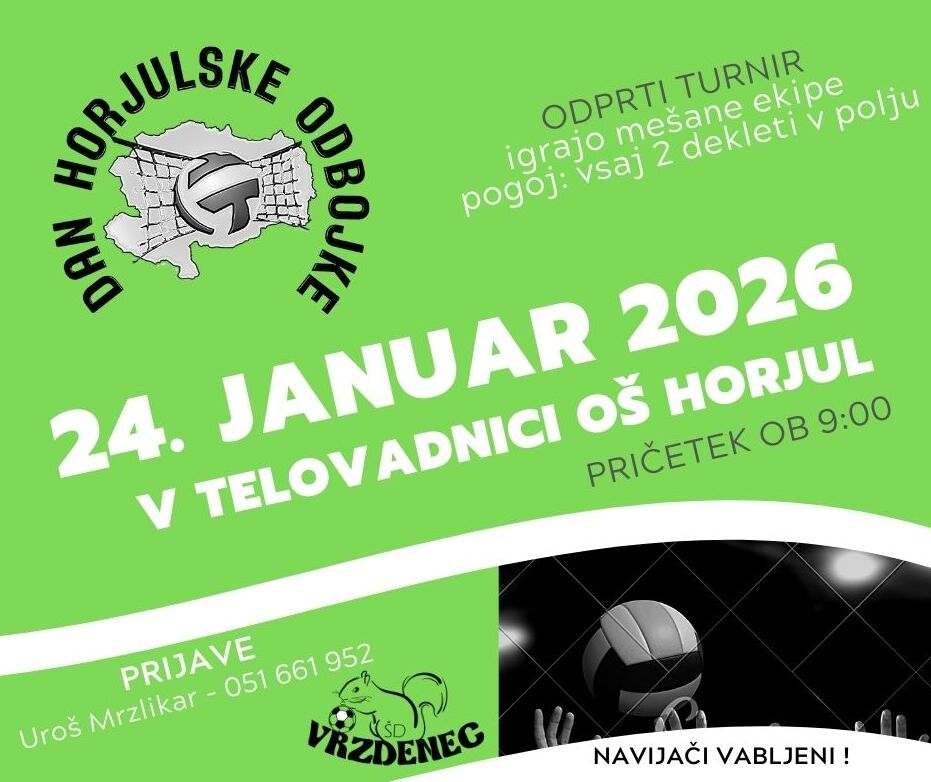 ŠD Vrzdenec vas vabi na DAN HORJULSKE ODBOJKE, ki bo v soboto, 24.1.2026, v telovadnici OŠ Horjul. Začetek ob 9. uri.