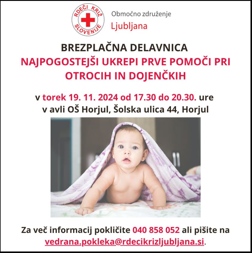 Rdeči križ Ljubljana v sodelovanju z občino Horjul in OŠ Horjul organizira brezplačno delavnico Najpogostejši ukrepi prve pomoči pri otrocih in dojenčkih.