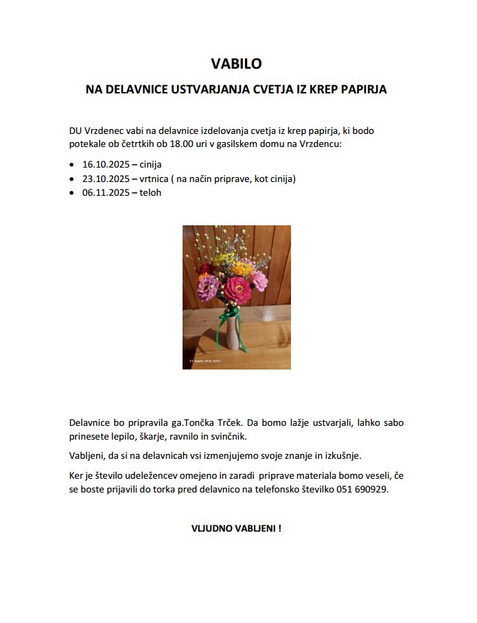 DU Vrzdenec vabi na delavnice izdelovanja cvetja iz krep papirja, ki bodo potekale ob četrtkih ob 18.00 uri v gasilskem domu na Vrzdencu: