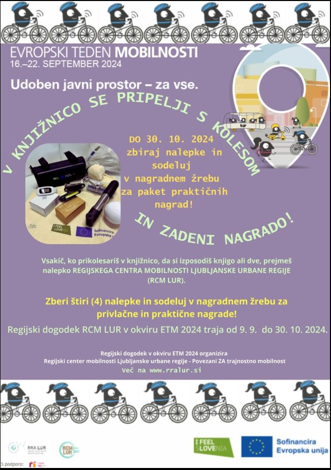 »Pripelji se s kolesom v knjižnico in zadeni nagrado!« je regijski dogodek Evropskega tedna mobilnosti 2024, ki ga organizira Regijski center mobilnosti Ljubljanske urbane regije s podporo Mestne knjižnice Ljubljana. Na pot v knjižnico se podajte s kolesom, zberite 4 (štiri) nalepke in sodelujte v nagradnem žrebu za privlačne praktične nagrade!