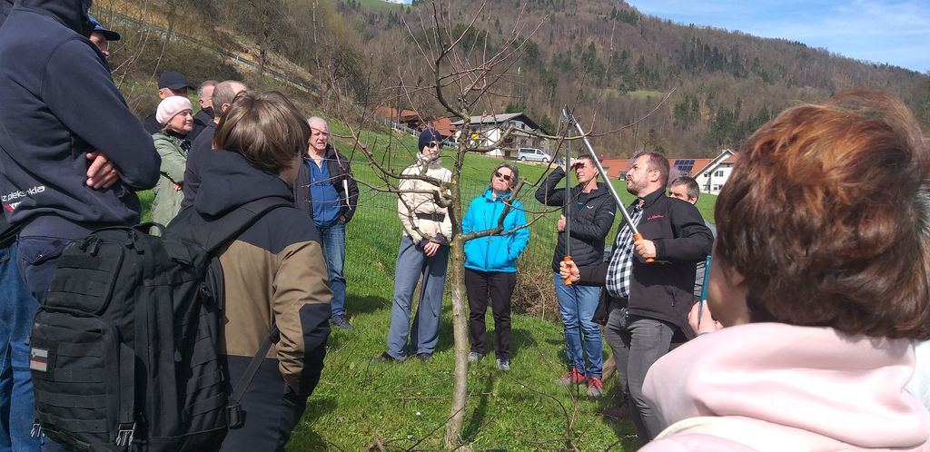 Prikaz pravilnega obrezovanja sadnega drevja je vodil profesor dr. Robert Veberič z Biotehniškene fakultete, ki je tudi odgovarjal na vsa vprašanja, ko so se vsi skupaj tudi s praktičnim prikazom sprehodili skozi šolski sadovnjak, ki se nahaja ob poti zgornjega parkirišča proti šolskemu čebelnjaku.