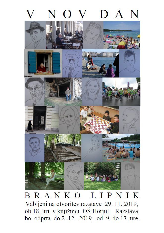 Vabljeni na razstavo V nov dan Branka Lipnika. Odprtje razstave bo 29. novembra ob 18. uri v knjižnici OŠ Horjul. Odprta bo do 2. decembra od 9. do 13. ure.