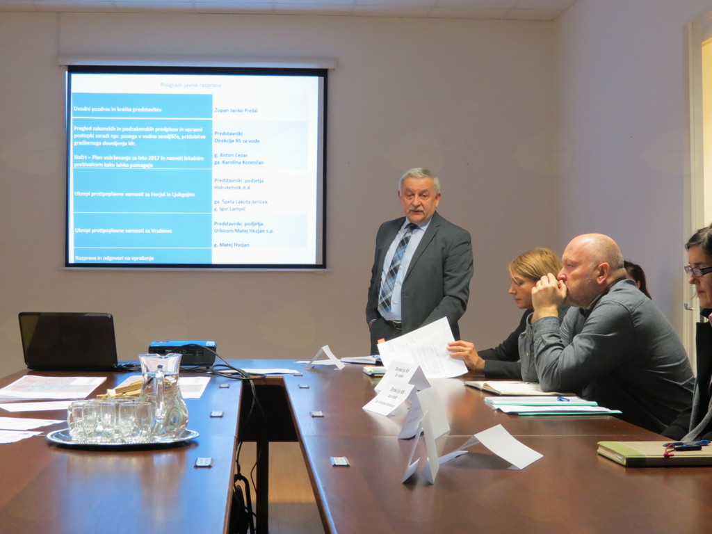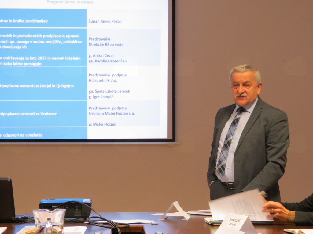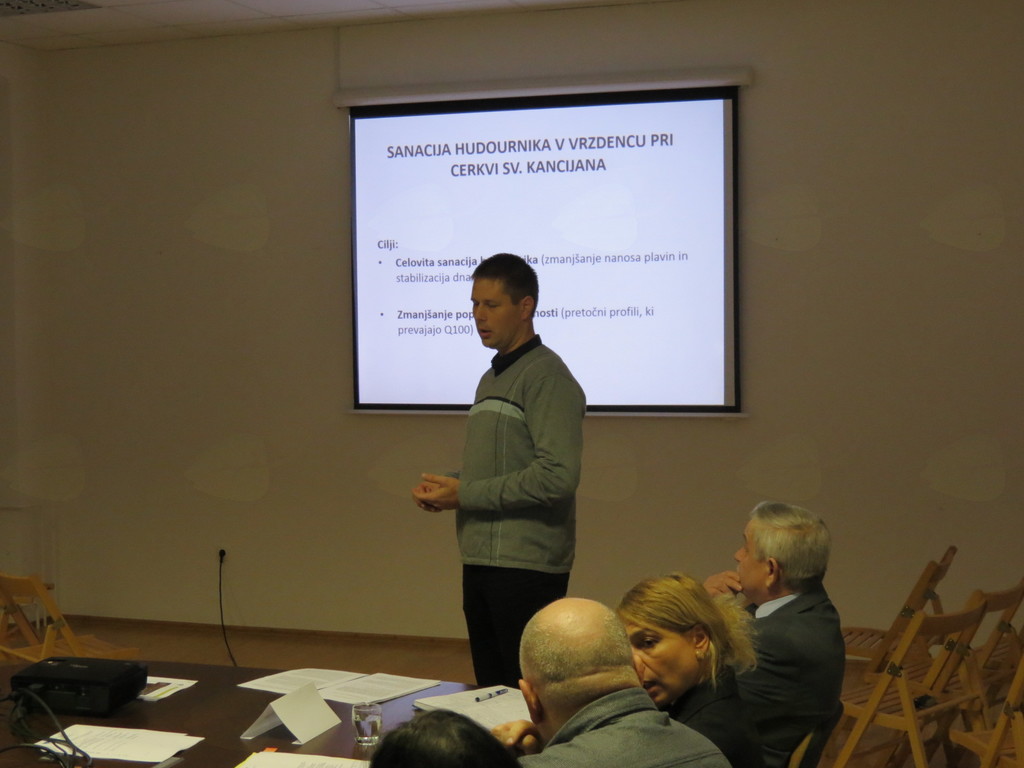 Na povabilo župana so bili uvodničarji v javno predstavitev predstavniki Direkcije Republike Slovenije za vode in podjetja Hidrotehnik, ki so pristojni za vzdrževanje vodnih zemljišč ter predstavniki pripravljavcev projektne dokumentacije za zmanjšanje poplavne ogroženosti na območju naše občine.