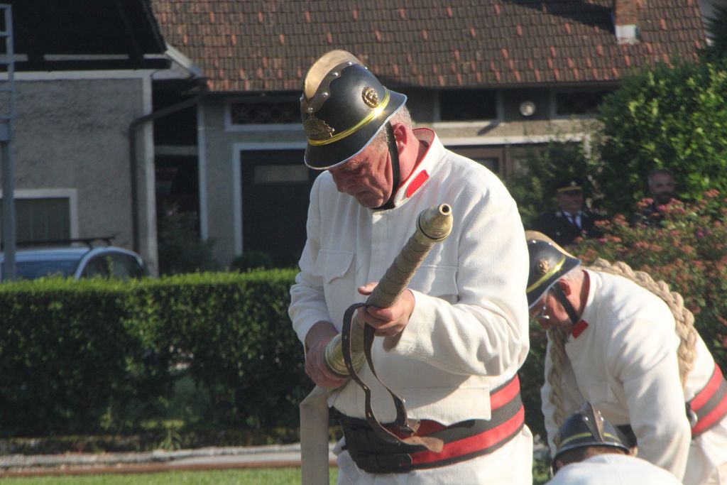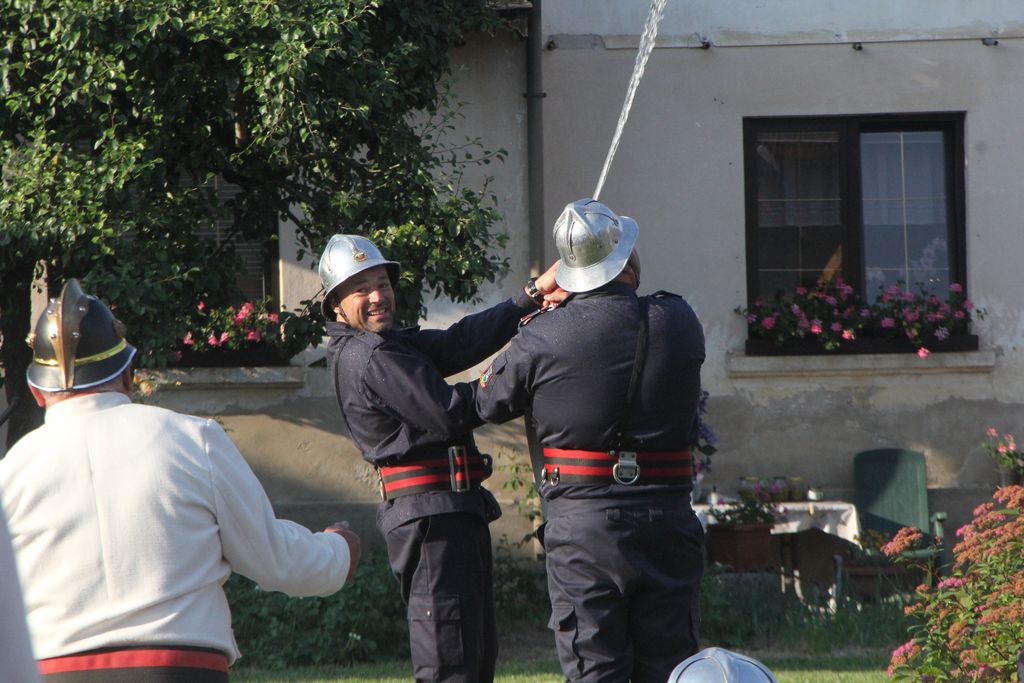Ko se je izza lesene kolibe pokadil gost dim, se tokrat niso oglasile sirene ampak zvonec, ki je opozoril na nevarnost požara. Gasilci v belih opravah in s svetlečimi čeladami so prihiteli na pomoč ob zvokih roga in ne gasilske sirene kot nekoč, pred recimo stotimi leti. Namesto gasilskega avtomobila je voz z ročno brizgalno vlekla konjska vprega. Vsekakor je bil prizor nekaj izjemnega za vse zbrane, predvsem pa je presenetila usklajenost in dinamika gasilske ekipe veteranov, ki so hitro in učinkovito pogasili požar. Seveda je šlo za prikaz, oziroma vajo, kjer so tudi pokazali opremo s katero so gasilci nekoč gasili požare.