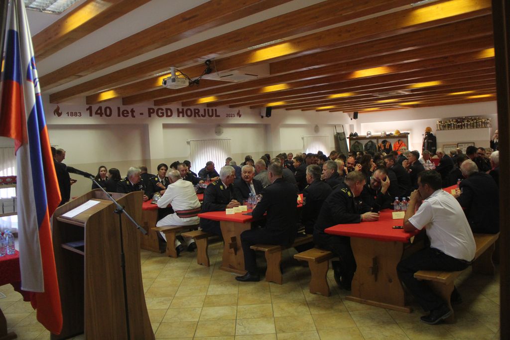 Po nekaj besedah dobrodošlice s strani vodstva društva in obveznega fotografiranja z najstarejšimi člani je sledil še slavnostni del, kjer so v nagovorih sodelujoči pozdravili goste iz domačih in okoliških društev ter opisali bogato zgodovino gasilstva v Horjulu. Morda niste vedeli, ampak prav tu v Horjulu je ena od zibelk prostovoljnega gasilstva v Sloveniji, saj so bili prav tu med prvimi, ki so se organizirali na tak način v boju proti požarom, ki so bili pred 140 leti pogostejši in žal zaradi slamnatih streh ter odprtih kurišč bolj pogosti kot dandanes.