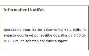 Občina Horjul je torej že aprila 2005 sklenila pogodbo in izdala prvo dovoljenje za poslovanje podružnični lekarni Moja Lekarna, in sicer na podlagi koncesije, ki je delovala pod okriljem matične lekarne na Škofljici. Toda v avgustu 2011 so se zaradi izteka koncesije na Škofljici začele pojavljati težave tudi pri poslovanju in obratovanju lekarne v Horjulu. Na to se je občina kaj hitro odzvala in že v naslednjem mesecu izdala dovoljenje za poslovanje podružnični lekarni Moja Lekarna, ki pa je delovala na podlagi koncesije na Dobrovi. Ta je normalno obratovala vse do oktobra 2013, ko so tako lekarno na Dobrovi kot v Horjulu zaradi težav lekarnarice brez obvestila in pojasnila zaprli. Na občini pravijo, da se takratni koncesionar (Moja Lekarna) na njihova vprašanja in opozorila ni odzival, dejstvo je, da je lekarno sredi novembra brez vednosti občine prevzel drug koncesionar, in sicer Lekarna pri Kranjskem Orlu. Ker je lekarniška storitev za Horjulce pomembna in so je vajeni, se je občina odločila in januarja 2014 izdala le začasno dovoljenje za poslovanje podružnične Lekarne pri Kranjskem Orlu, ki pa se je izteklo 6. aprila. Na občini so povedali, da so v tem času iskali najustreznejšega in resnega koncesionarja, ki bo brez prekinitev nadaljeval lekarniško dejavnost v Horjulu. Tako je Občina Horjul v začetku letošnjega aprila izdala dovoljenje za poslovanje lekarniške dejavnosti Javnemu zavodu Lekarna Ljubljana, in to za obdobje desetih let. Ta je v prostoru centra starejših občanov, na Slovenski cesti 17 v Horjulu, sicer začel obratovati v ponedeljek, 7. aprila, slovesno odprtje pa bo 23. aprila. Več o uradnem odprtju in morebitnih novostih pa boste lahko prebrali v naslednji številki Našega časopisa.
