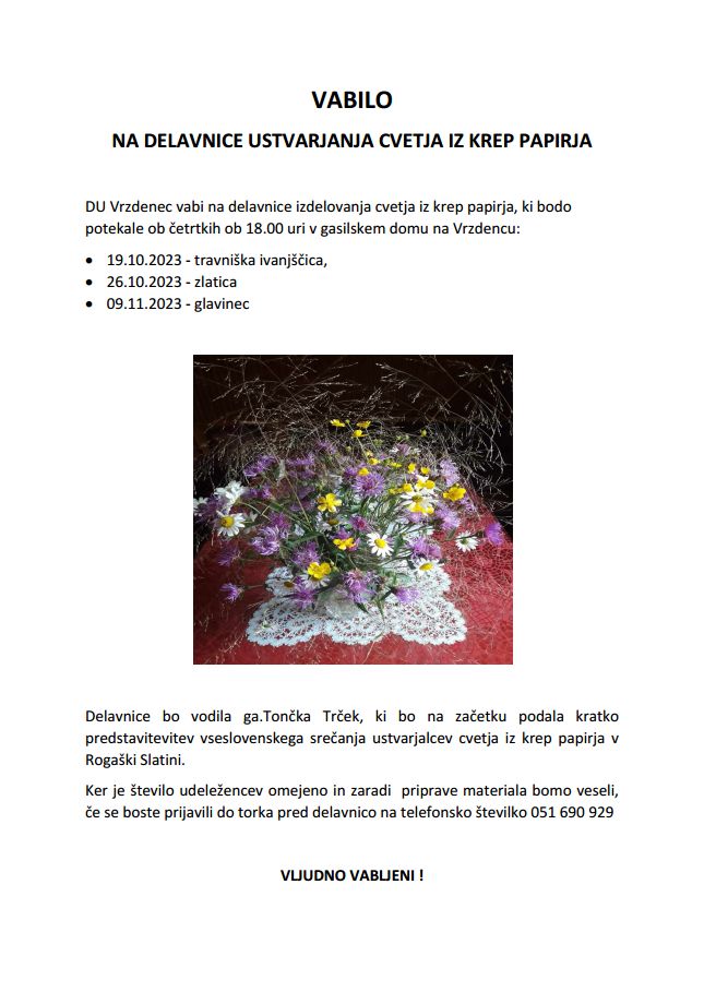 Društvo upokojencev Vrzdenec vabi na delavnice izdelovanja cvetja iz krep papirja, ki bodo potekale ob četrtkih ob 18. uri v Gasilskem domu na Vrzdencu in sicer: