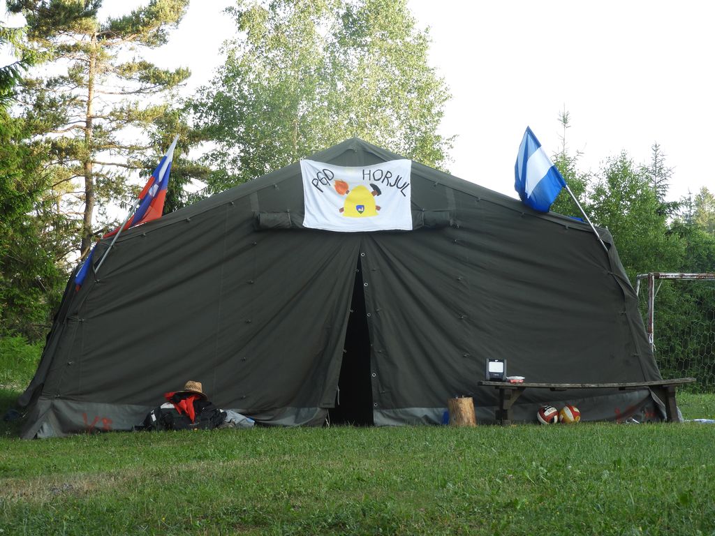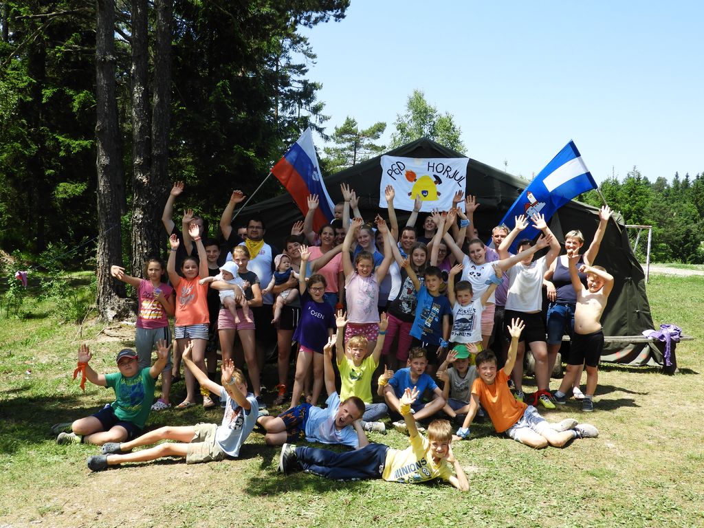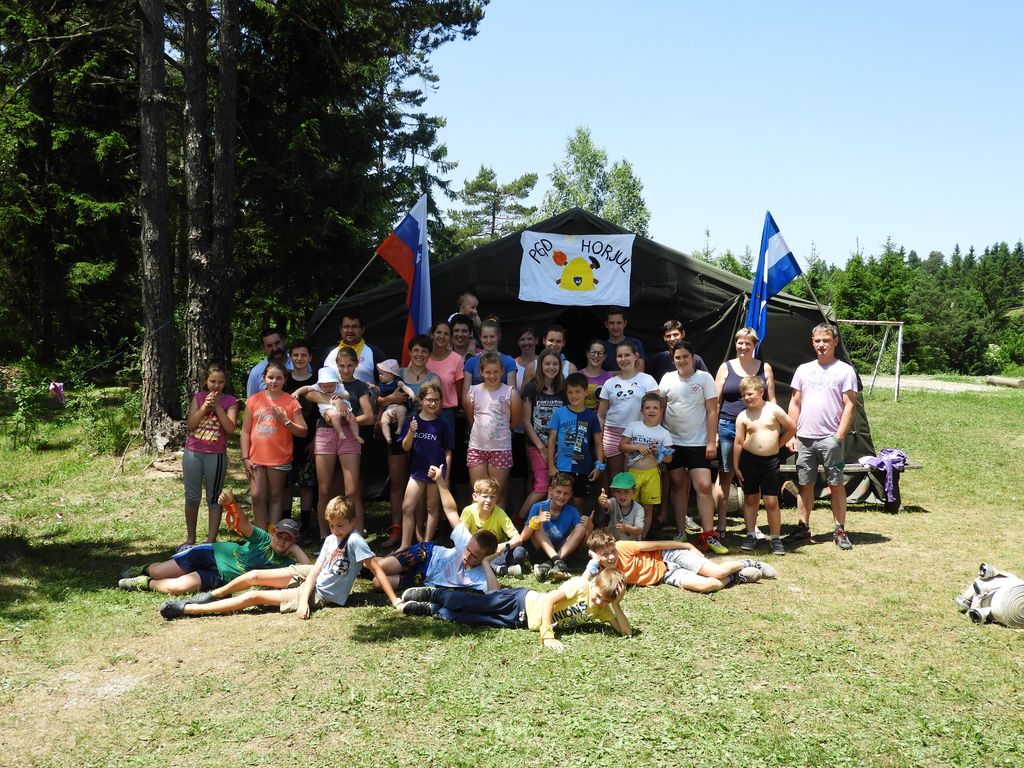 Meseca junija se vsi veselimo. Zlasti letos, ko je po obilnem deževju le posijalo sonce. Temperature so višje in čas je, da se znebimo dolgih rokavov. Končno lahko oblečemo poletna oblačila. Junij je dobrodošel tudi za otroke, saj končno zaključijo vse šolske obveznosti. Imajo pa otroci iz PGD Horjul takrat še eno veliko pričakovanje, gasilsko kampiranje. Letos smo se odpravili že na 4. kampiranje, ki je potekalo na Pokojišču. Težko pričakovan tridnevni odklop se je začel v petek, 14. junija, ko smo se v popoldanskih urah odpeljali proti Borovnici ter se po strmi cesti povzpeli proti Pokojišču. Naš prostor za kampiranje je bil pri gasilskem domu. Na začetku so starejši fantje pomagali pri postavitvi šotora, punce pa so naredile zastavo, ki je krasila vhod šotora.